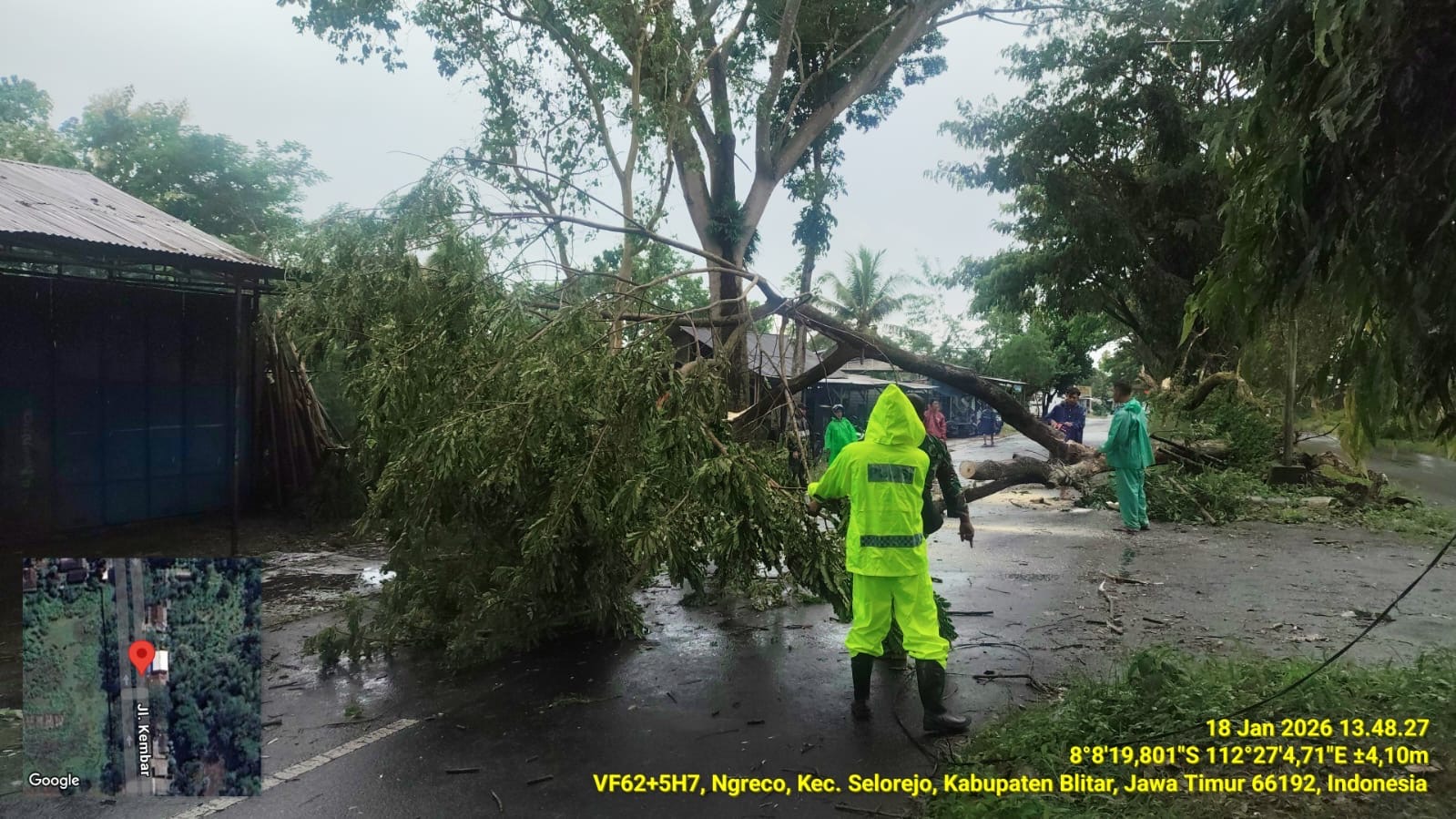 Blitar Raya News – Hujan yang disertai angin kencang mengakibatkan sebuah pohon tumbang di Jalan Kembar, Desa Ngreco, Kecamatan Selorejo, Kabupaten Blitar, Minggu (18/1/2026) siang. Peristiwa tersebut terjadi sekitar pukul 13.45 WIB.