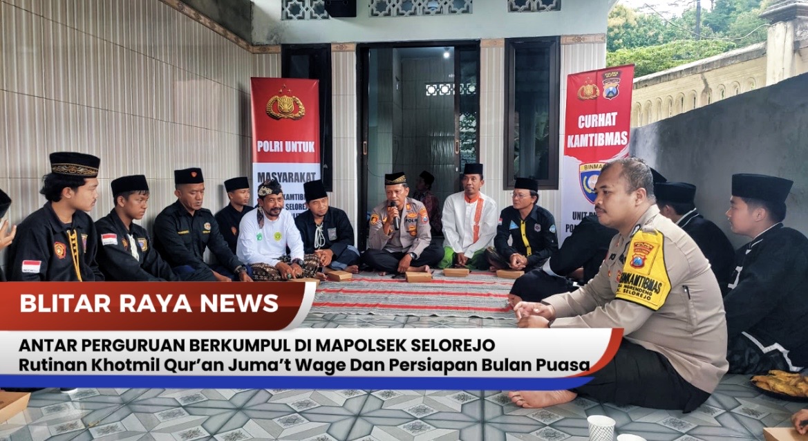 Polsek Selorejo Polres Blitar bersama tokoh agama serta perguruan pencak silat PSHT, PSHW, IKSPI, dan Pagar Nusa wilayah Kecamatan Selorejo melaksanakan kegiatan rutin Doa Bersama dan Khotmil Qur’an Jum’at Legi, Jumat (13/2/2026).