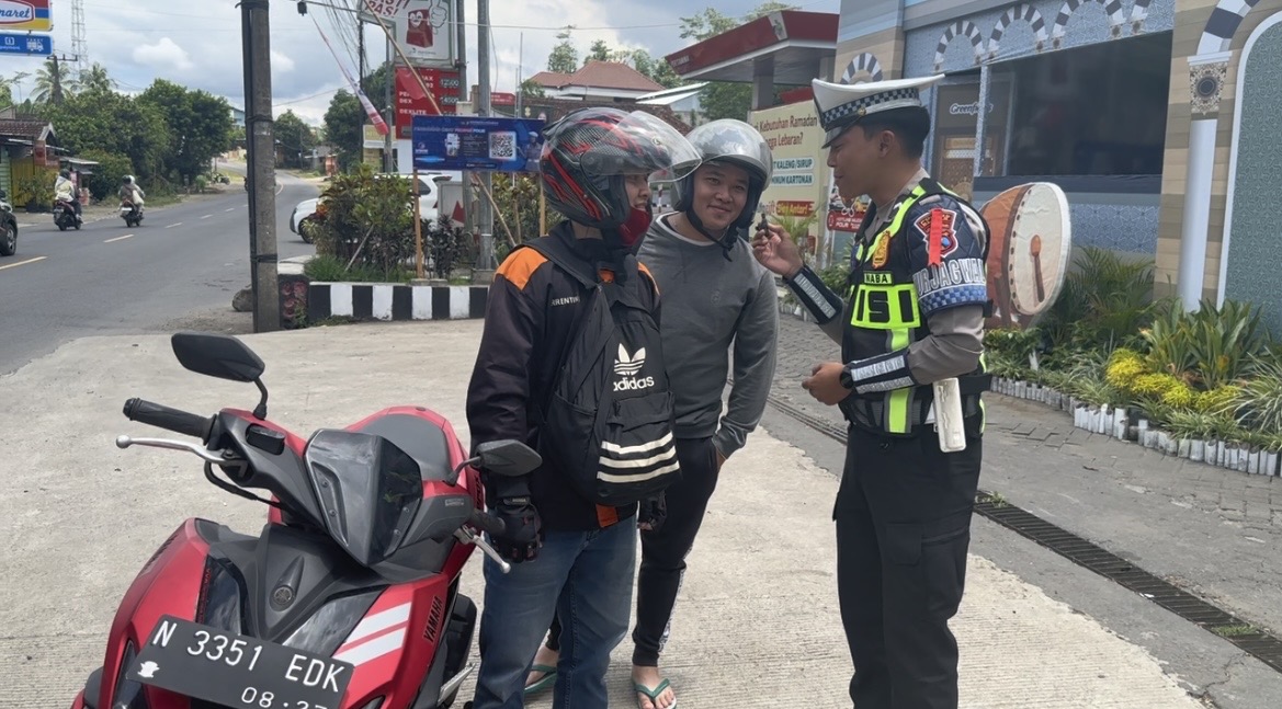 Setibanya di Pos Pam, Feren dan Renal disambut oleh petugas jaga, Bripda Nabaha Wildan. Dalam kesempatan tersebut, petugas turut memastikan kondisi pemudik tetap aman dan prima sebelum melanjutkan perjalanan.
